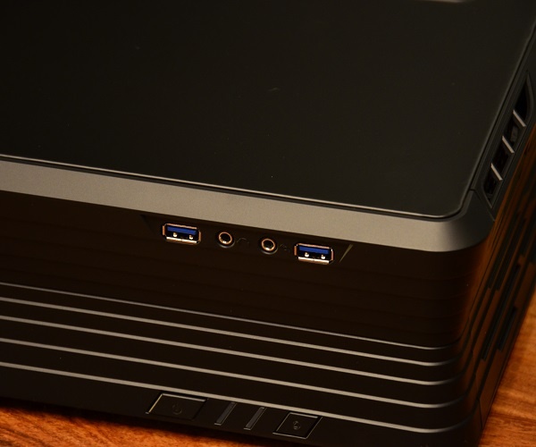 Aan de voorkant zien we de opvallende horizontale (tenminste, als je de case horizontaal plaatst) strepen, het Raven logo, de audio, microfoon, en 2 USB 3.0 poorten, en uiteraard de aan-/uit schakelaar en resetknop. Ook de keuze voor de slim-slot-loading optical drive geeft een leuk resultaat.