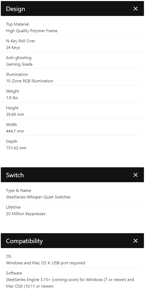 So far so good toch? Maar er is wel één catch, en dat is de switch. Ik moet even op de productpagina kijken wat de exacte naam is, want elke fabrikant heeft zo zijn eigen marketing-blaat.. ik bedoel praat.. over hoe goed hun niet-mechanische switch is. We hebben gekke dingen gehoord in elk geval, maar Steelseries houdt het bescheiden heeft het over de “Whisper quiet gaming switch” die 20 miljoen aanslagen mee moet gaan. Op zich best netjes, want een typische dome switch doet er 2 a 5.