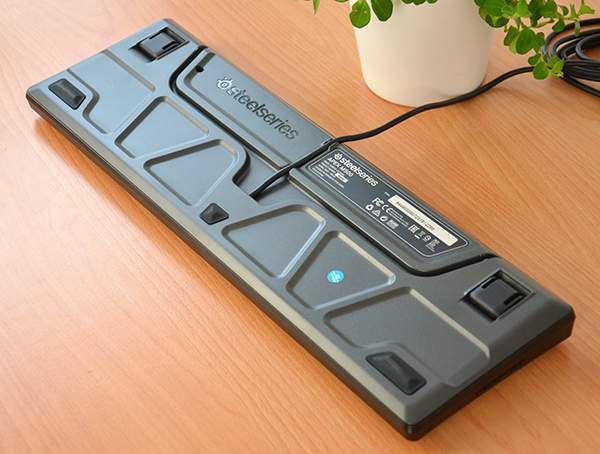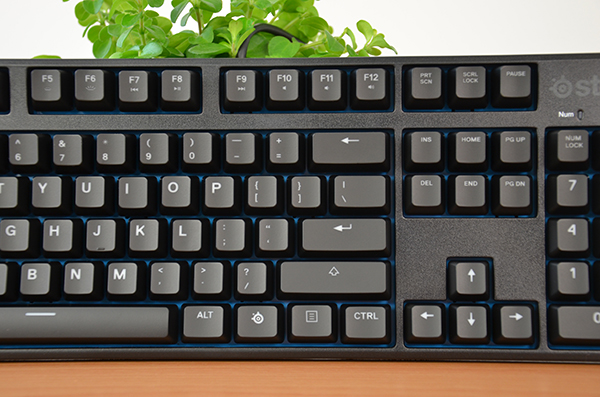 Wat indeling betreft weinig verrassingen, we zien ook geen extra features zoals fysieke media knoppen of losse macro knoppen, op het blote oog en zeker op het afstandje is het een ‘gewoon’ toetsenbord; pas als je hem optilt voel je dat er een flinke stalen plaat onder zit en dat het materiaal dus duidelijk dikker is. Zoomen we wat in dan zien we ook de ietwat ruwere structuur van het kunststof. Toch lijkt het enkel de flinke SteelSeries print naast de status LEDs die visueel doet vermoeden dat dit meer is dan een standaard plank, of je moet vanaf de zijkant de gegraveerde letters opmerken.