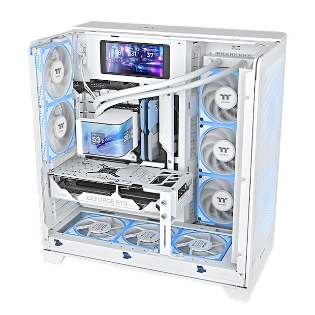 Centraal in het ontwerp staat het 6,67 inch gebogen AMOLED-display met een resolutie van 2240 x 1080 pixels. Dit scherm levert levendige kleuren, diep contrast en een meeslepende kijkervaring, terwijl het tegelijkertijd functionele informatie kan tonen zoals real-time systeemstatistieken, tijd, lokale weersinformatie en videoweergave. Dankzij de geïntegreerde AI Forge-functie kunnen gebruikers via eenvoudige tekstprompts unieke achtergronden genereren binnen de TT RGB PLUS 3.0 software, zonder externe tools of downloads.