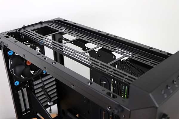 Hoewel het vertical GPU bracket er standaard in zit onbreekt de PCIe riser ervoor, die moet je los kopen. Sowieso wil je je videokaart niet tegen het glas aan zetten, deze functie is er puur en alleen voor mensen die met waterkoeling aan de slag gaan. Verder zien we weinig opvallends, anders dan heel veel ruimte voor koeling.